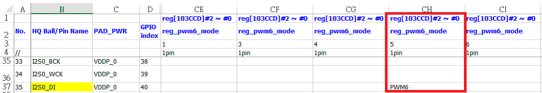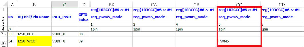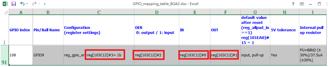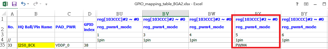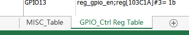注意:当设置GPIO Mode的时候,请参考表格GPIO_Ctrl Reg Table sheet,其余模式参考MISC table sheet。