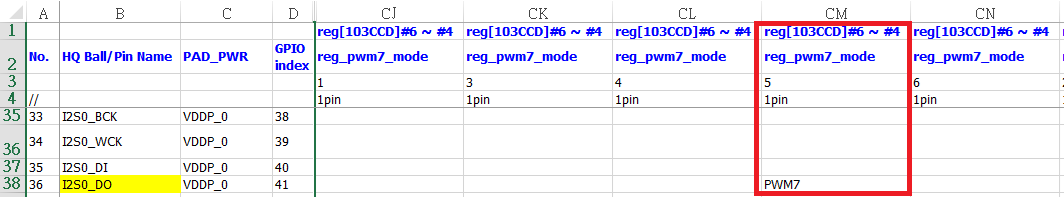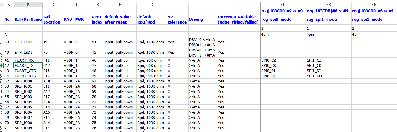 每一个chip都有一个gpio map文件,命名一般为SSCxxx GPIO_mapping_table.xlsx,下表显示每一个pin脚可复用的功能和对应的寄存器设置。
