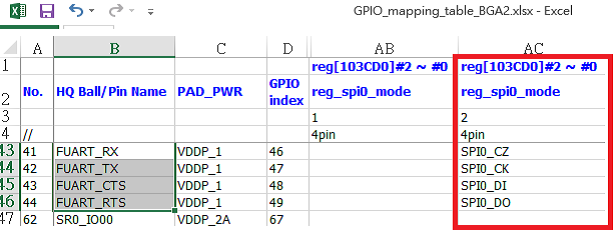 下图显示了PAD _FUART _xxx到GPIO映射表的映射: