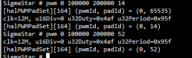 pwm 0 100000 200000 14 //pwm0输出5000HZ, duty cycle=50%,PAD为PAD_FUART_RX.