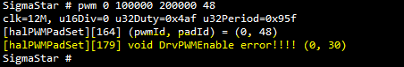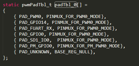 Step3: DrvPWMEnable(id, enable, pad);//PWMid状态为enable并指定出到哪个PAD, 快速搜索pwmPadTbl_t