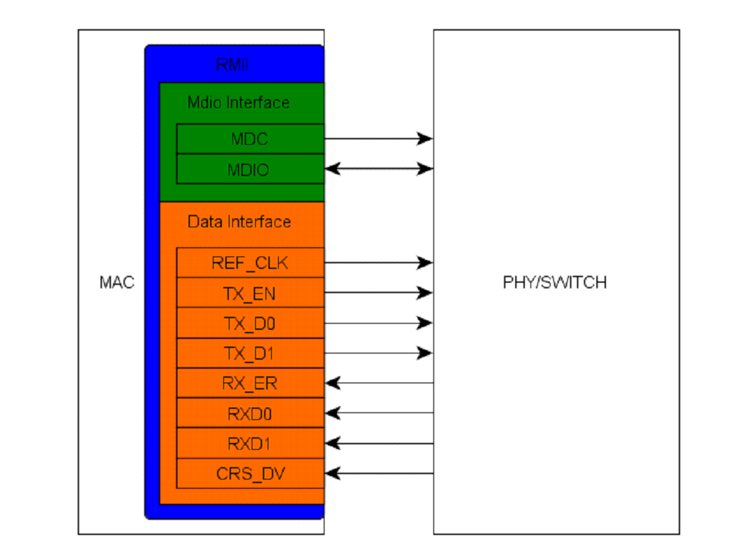 RMII接口包括一个数据接口,以及一个MAC和PHY之间的管理接口。MDIO管理接口包括两根信号线(MDC与MDIO),通过这个接口MAC可以读取PHY或者Switch芯片寄存器实现传输信息与状态控制。