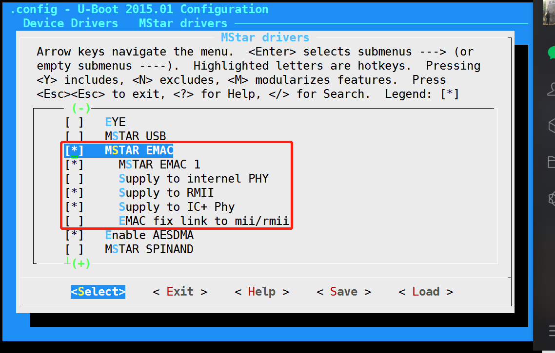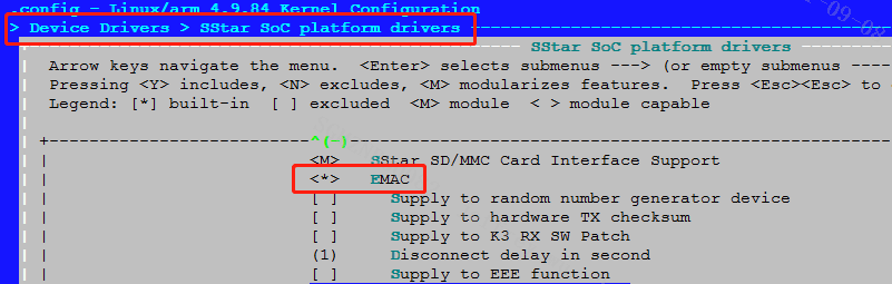 menuconfig中使能emac,关闭内置phy并打开rmii接口,如下: