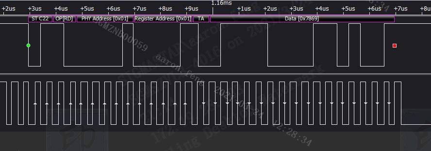 需要注意的是read操作时,针对主控这边MDC时钟在TA信号后会变成下降沿采样,如下图所示;write操作会一直保持上升沿采样。要确定MDIO是否读写正确可使用逻辑分析仪捕捉MDIO与MDC信号波形。