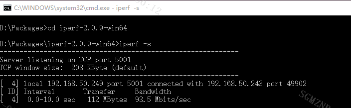 PC端作为server,板端作为client。Windows中打开cmd命令行,输入iperf -s以server模式运行iperf,如下图所示: