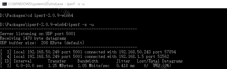PC端作为server,板端作为client。Windows中打开cmd命令行,输入iperf -s -u以server模式运行iperf,如下图所示: