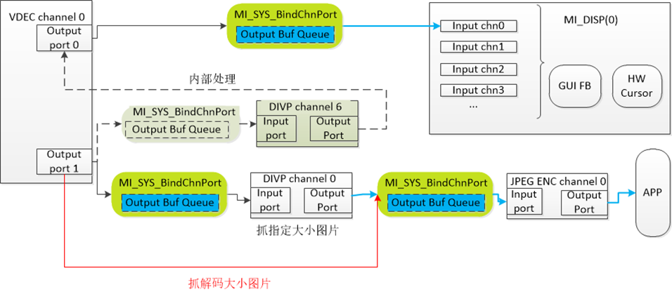 从port1解码后的数据帧分两条路线走,要么给APP抓图拿走,要么从MI DIVP内部抓取给VDEC port0,再通过port0给到MI DISP。如下图