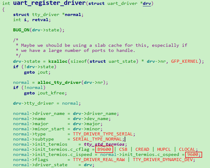 分析发现,因底层的波特率设置不成功导致无法接收数据,可尝试修改串口的默认波特率为所需的值,kernel/drivers/tty/serial/serial_core.c