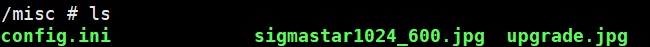 [LOGO] m_eDeviceType = 3; #0 None, 1 LCD, 2 HDMI, 3 VGA m_sParaTarget = DACOUT_1080P_60 m_wDispWidth = 1280 m_wDispHeight = 800 m_wDispFps = 60 m_sLogoFile0 = sigmastar1024_600.jpg m_sLogoFile1 = upgrade.jpg