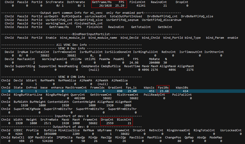 echo drop_out a d > /proc/mi_modules/mi_venc/mi_venc0 代表所有通道编码完数据直接丢弃,下此命令后帧率恢复正常。