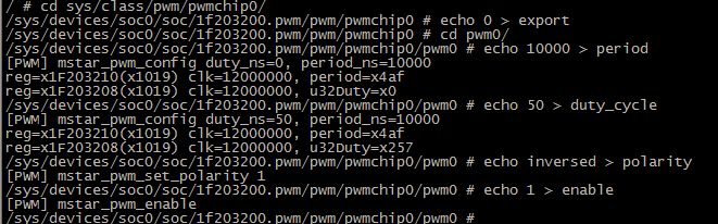 1. # 跳转到PWM控制路径 2. cd sys/class/pwm/pwmchip0/ 3. 4. # 创建PWM0节点 使用PAD_GPIO0 5. echo 0 >export 6. 7. # 进入PWM0控制路径 8. cd pwm0 9. 10. # 配置周期 11. echo 100000 >period 12. 13. # 设置占空比 14. echo 50000 >duty_cycle 15. 16. # 使能PWM0 17. echo 1 >enable