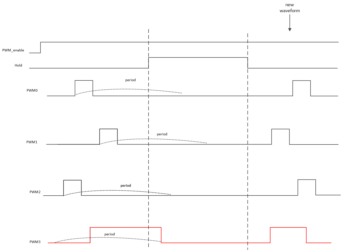 使用中需要Group在enable之后,更改PWM的period、begin、end的值时,先进行配置,再下Hold_mode_0使能命令来触发中断,将新的配置下到寄存器中来使其生效。
