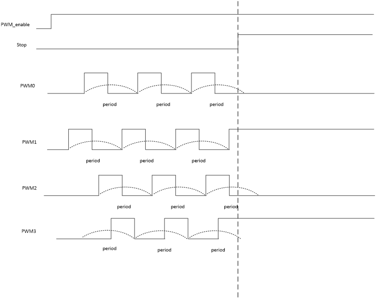 Stop功能可以让当前Group中的PWM立即停止(不会等当前周期完成),PWM会维持结束时的电平。Stop命令如下: