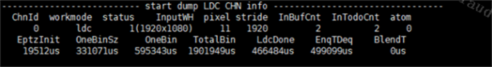 参数 描述 Channel Info ChnId 通道ID workmode 当前channel的工作模式 status 当前channel的状态:0:init 1:start 2:stop 3:destroyed InputWH 输入帧的分辨率 Pixel 输入帧的格式 Stride 输入帧的stride[0] InBufCnt 前级输入的帧总数量 IntodoCnt 待处理帧的标号(递增) Atom 底层拿住 buffer 数量 EptzInit 初始化算法所用时间 OneBinSz 计算最新view 的buffer size 所用时间 OneBin 计算最新view所用时间 TotalBin LDC 算法计算所有view的时间 LdcDone LDC 硬件处理时间 EnqTDeq 拿到前级buf到处理完的总时间 BlendT alpha blending 所用时间