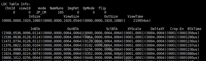 0:2048x16 1:1024x32 2:512x64 3:256x128 4: 128x256flip ldc的镜像模式 InSize 当前view的输入区域 ViewSize 当前view的输出区域 OutSize 当前场景的输出区域 ViewTime 当前view的处理时间 Inblk 当前blk的输入区域 OutBlk 当前blk的算法输出区域 SclBlk 当前blk的输出区域 DeltaXY 当前blk对应delta 表的坐标 BlkTime 对应blk的处理时间