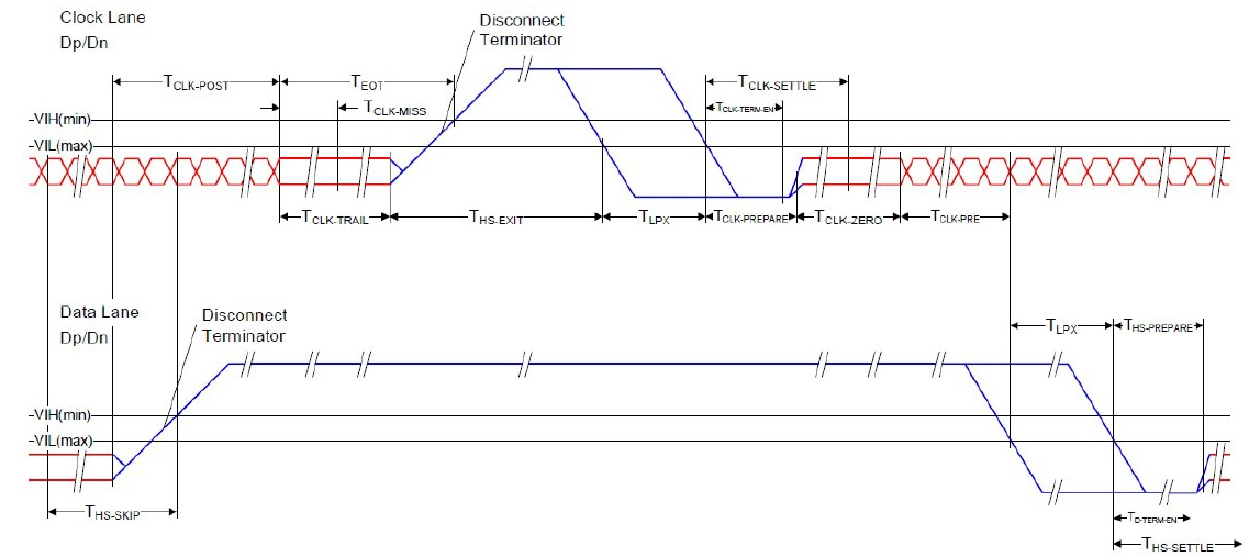 成员名称 描述 u8ClkHsPost 所有data lane进入低功耗模式后,Clock lane保持高速时钟状态时间, 如图3-2中TCLK-POST u8ClkTrail 进入低功耗模式前Clock lane维持HS-0 时间,如图3-2 TCLK-TRAIL u8Lpx 低功耗模式Clock lane维持LP-01时间,如图3-2 TLPX u8ClkHsPrpr 低功耗模式Clock lane维持LP-00时间,如图3-2 TCLK-PREPARE u8ClkZero 进入高速模式前Clock lane维持HS-0时间,如图3-2 TCLK-ZERO u8ClkHsPre Data传输之前Clock lane维持高速时钟时间,如图3-2 TCLK-PRE u8HsPrpr Data 传输之前Data Lane维持LP-00时间, 如图3-1 THS-PREPARE u8HsZero Data 传输之前Data Lane维持HS-0时间, 如图3-1 THS-ZERO u8HsTrail Data 传输结束后Data Lane维持HS-0或HS-1,如图3-1 THS-TRAIL