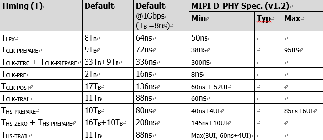 typedef struct MI_MipiTx_TimingConfig_s { MI_U8 u8Lpx; MI_U8 u8ClkHsPrpr; MI_U8 u8ClkZero; MI_U8 u8ClkHsPre; MI_U8 u8ClkHsPost; MI_U8 u8ClkTrail; MI_U8 u8HsPrpr; MI_U8 u8HsZero; MI_U8 u8HsTrail; } MI_MipiTx_TimingConfig_t; -
