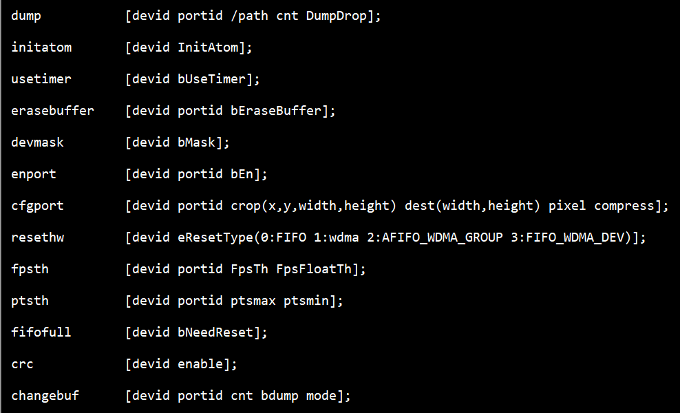| 参数说明 | devid: device id portid: port id path: 路径存放 cnt: 可选参数,设置要dump的张数,不设置默认为1 dumpdrop: 可选参数,设置为1只dump需要drop的frame,默认为0 |