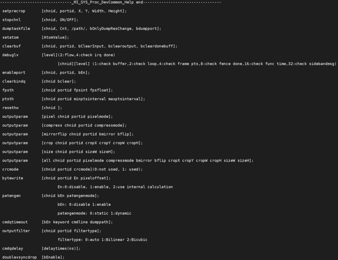 | 举例 | echo ptsth 0 0 30000 40000 > /proc/mi_modules/mi_scl/mi_scl0 //channel0 port0中pts小于30ms,大于40ms的值打印出来 |
