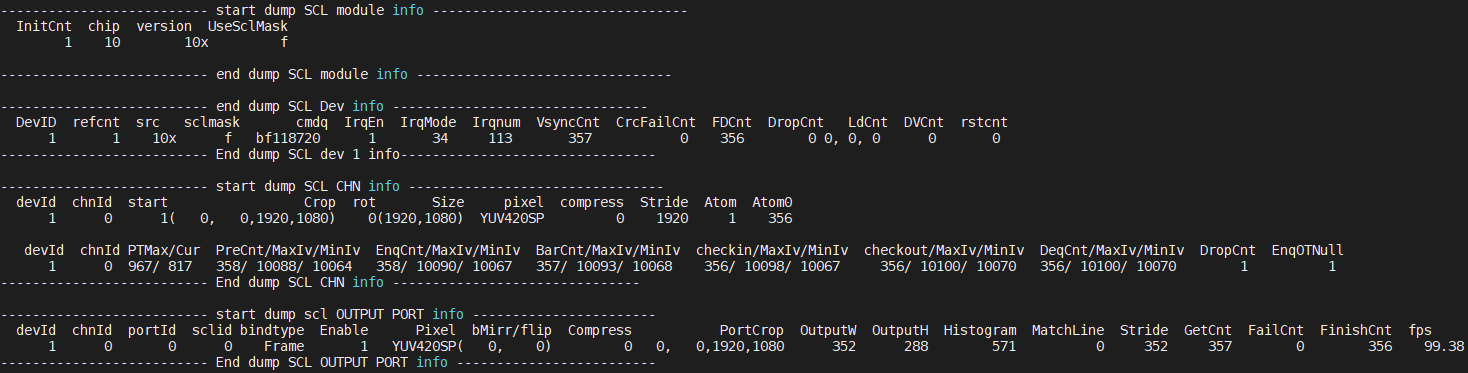 参数 描述 module info InitCnt 发生connected module次数 chip Chip index version Chip version UseSclMask 模块scaler使用情况 Device Info DevID 设备ID refcnt 重复创建dev次数 src 输入源 sclmask 设备使用Scaler id cmdq Cmdq 指针 IrqEn IRQ 使能状况 IrqMode IRQ 模式 Irqnum IRQ ID VsyncCnt ISR vsync Cnt crcFailCnt input crc 校验失败次数 FDCnt ISR Frame Done Cnt DropCnt IRQ Frame Drop or Double Vsync LdCnt Low Lantency Mode Match Line IRQ Cnt DVCnt double vsync cnt rstcnt reset hw cnt Channel Info DevId Device id ChnId Channel ID start Channel 是否start Crop Channel Crop位置 Rot Rotation 角度 Size Input width/height pixel Input Pixel format compress input 压缩类型 Stride Input buffer stride Atom 底层拿住buffer 数量 Atom0Cnt 释放buffer后底层拿不到buffer的次数 PTMax/Cur 硬件处理所花最长时间/当前帧硬件处理所花时间 PreCnt/EnqCnt/BarCnt/checkin/