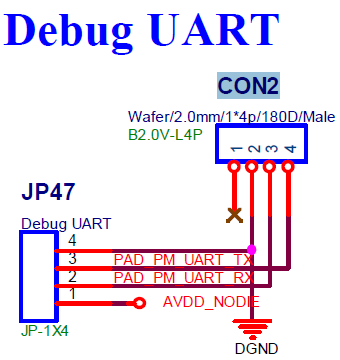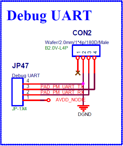 在内部有一路debug uart,公版电路图上显示pad,对应EVB的board有一路pad,对应CON2。Debug UART 仅供系统 logging 与 debug 使用。