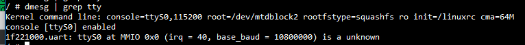 aliases { console = &uart0; serial0 = &uart0; }; ……. uart0: uart@1F221000 { compatible = "sstar,uart"; reg = < 0x1F221000 0x100 >; interrupts= < GIC_SPI INT_IRQ_UART_0 IRQ_TYPE_LEVEL_HIGH >; status = "ok"; clocks = < &CLK_uart0 >; };