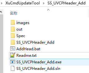 如上所说,SS_UVCPHeader_Add.exe是用于添加头部信息的。其所在目录内容如下图,其中SS_UVCPHeader_Add目录是SS_UVCPHeader_Add.exe工具的源码。使用这个工具的方式是执行AddHead.bat文件(双击或者右键“打开”),应该根据实际情况和需求来修改该文件的内容。下面将对该文件内容进行介绍。
