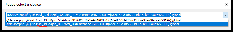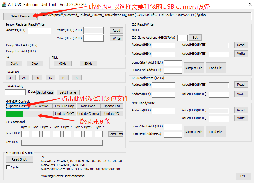 AitUVCExtTest.exe程序,在弹出的对话框中通过vid和pid(sigmastar平台默认vid为1b6b,pid为0102)来辨识并选择需要升级的USB camera设备,如下图: