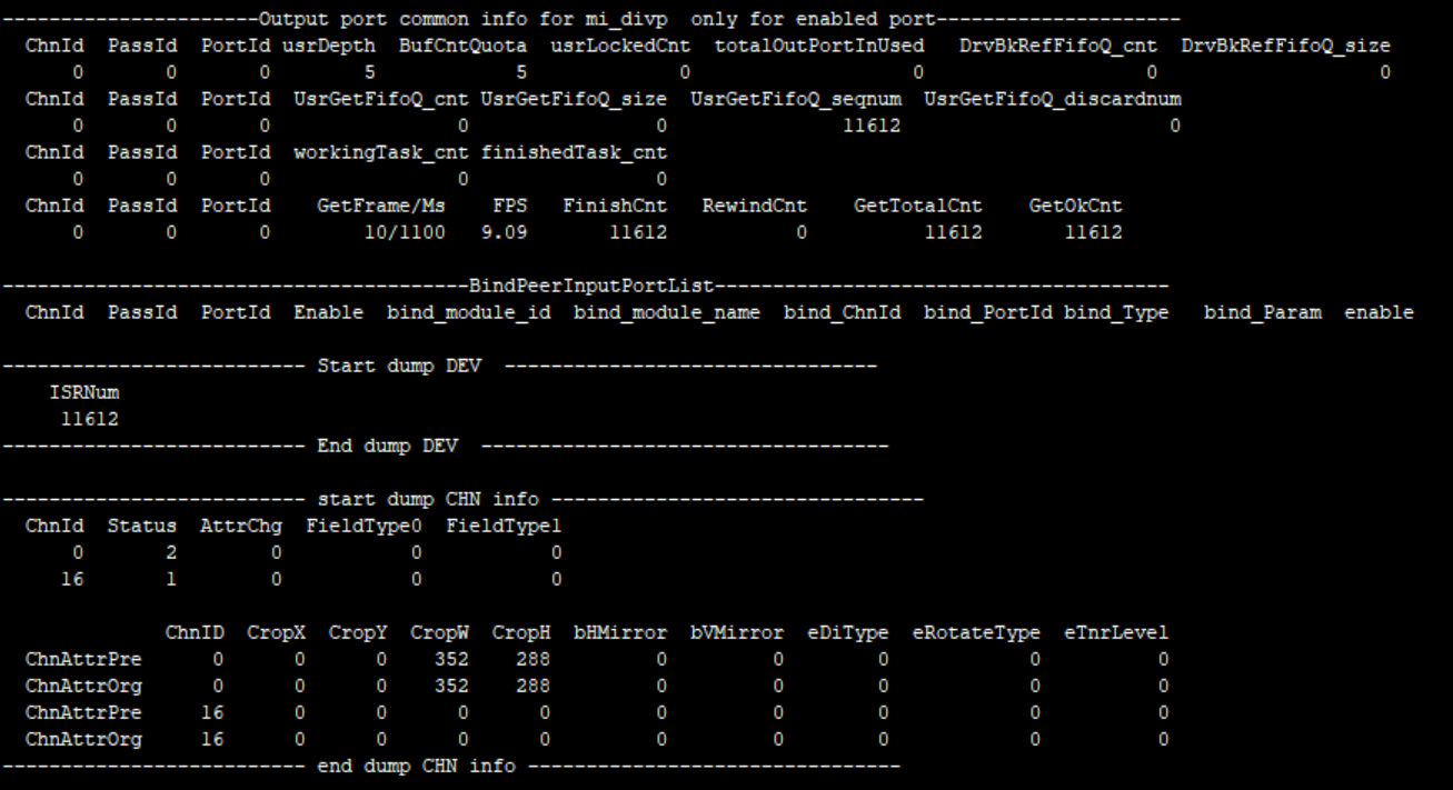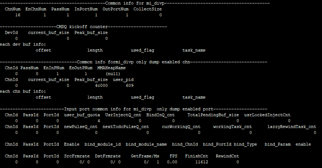 4 //numberPreWidth PreHeight 上一次设置的output port 宽和高 Stride Output 的stride phyaddr Output buffer 的物理地址 FinishTaskCnt Finish task的数目 fps Output port的帧率 Common Info ChnNum Channel的总数 Pixel 同input pixel PassNum Pass的总数 InPortNum Input port的个数 OutPortNum Output port的个数 CollectSize Attach的pstAllocator数目 current_buf_size 当前申请的内存大小 Peak_buf_size 使用内存的峰值 user_pid 进程id user_buf_quota User可以拿的buffer最大个数 UsrInjectQ_cnt User inject buffer个数 BindInQ_cnt 前端给input port enqueue的buffer个数 TotalPendingBuf_size 当前input working队列中各个task总共所占的buffer size usrLockedInjectCnt 用户拿到buffer的个数 newPulseQ_cnt new_pulse_fifo_inputqueque的buffer个数 nextTodoPulseQ_cnt next_todo_pulse_inputqueue的buffer个数 curWorkingQ_cnt cur_working_input_queue的buffer个数 workingTask_cnt input_working_tasklist的task个数 lazzyRewindTask_cnt 需要retry的task个数 bind_module_id 绑定的模块id bind_module_name 绑定的模块名字 bind_ChnId 绑定模块的channel id bind_PortId 绑定模块的port id bind_Type 绑定方式: