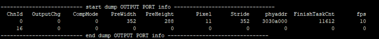 | 举例 | echo statintervaltime 0 ON > /proc/mi_modules/mi_divp/mi_divp0 [MI DIVP PROCFS]:ChnlID 0,1s FrameCnt:19,Average time: 50393 us,MAX 59601 us,57652 us,57534 us,MIN 41401 us,42415 us,42896 us [MI DIVP PROCFS]:ChnlID 0,1s FrameCnt:19,Average time: 50247 us,MAX 63004 us,62889 us,62845 us,MIN 36896 us,37120 us,37130 us [MI DIVP PROCFS]:ChnlID 0,1s FrameCnt:18,Average time: 51049 us,MAX 70431 us,59763 us,59736 us,MIN 38873 us,40109 us,40283 us [MI DIVP PROCFS]:ChnlID 0,1s FrameCnt:20,Average time: 48537 us,MAX 67168 us,67117 us,66953 us,MIN 18513 us,31242 us,32681 us [MI DIVP PROCFS]:ChnlID 0,1s FrameCnt:19,Average time: 49962 us,MAX 61416 us,61416 us,61338 us,MIN 38564 us,38736 us,38762 us FrameCnt: 1秒时间GetBuffer的数量 Average time: 拿到两个buffer之间间隔时间的平均时间 MAX:间隔时间最大的三个值。 MIN: 间隔时间最小的三个值 |