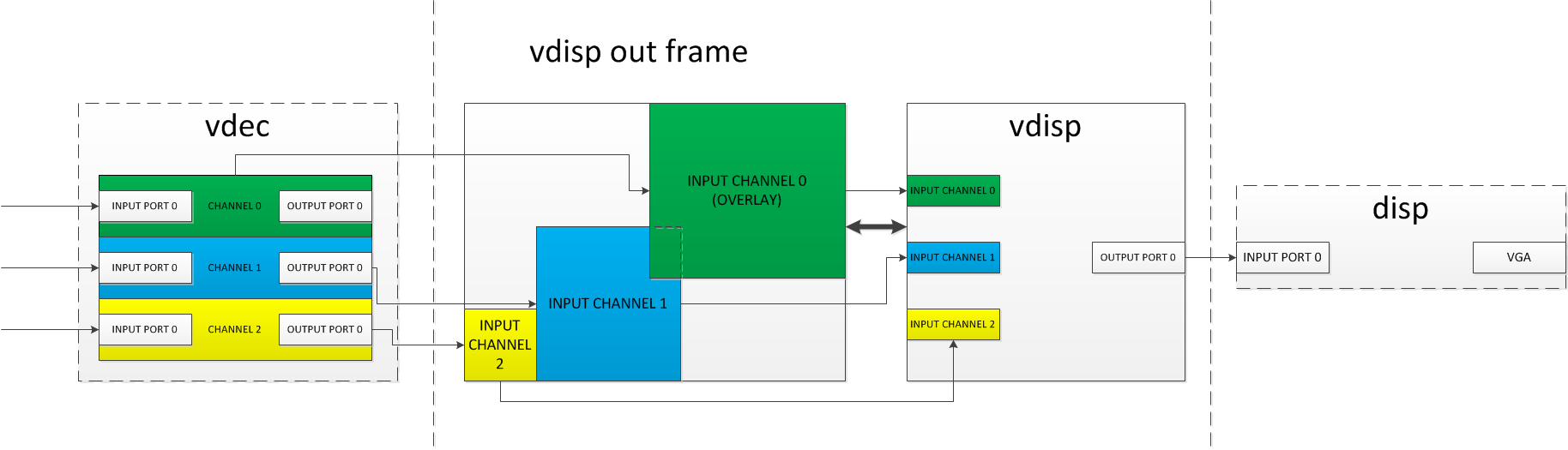 vdisp接收3路vdec数据,2路普通通道(黄色,蓝色),一路overlay通道(绿色),做拼图,完成之后给disp输出到VGA。