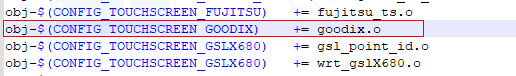 Add the linux driver provided by the IC manufacturer to the kernel/drivers/input/touchscreen/ directory, as shown below, add the driver file link in kernel/drivers/input/touchscreen/Makefile, and use a configuration CONFIG_TOUCHSCREEN_GOODIX to control