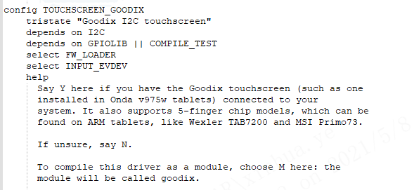 As shown below, add CONFIG_TOUCHSCREEN_GOODIX in kernel/drivers/input/touchscreen/Kconfig to add make menuconfig configuration switch in kernel config