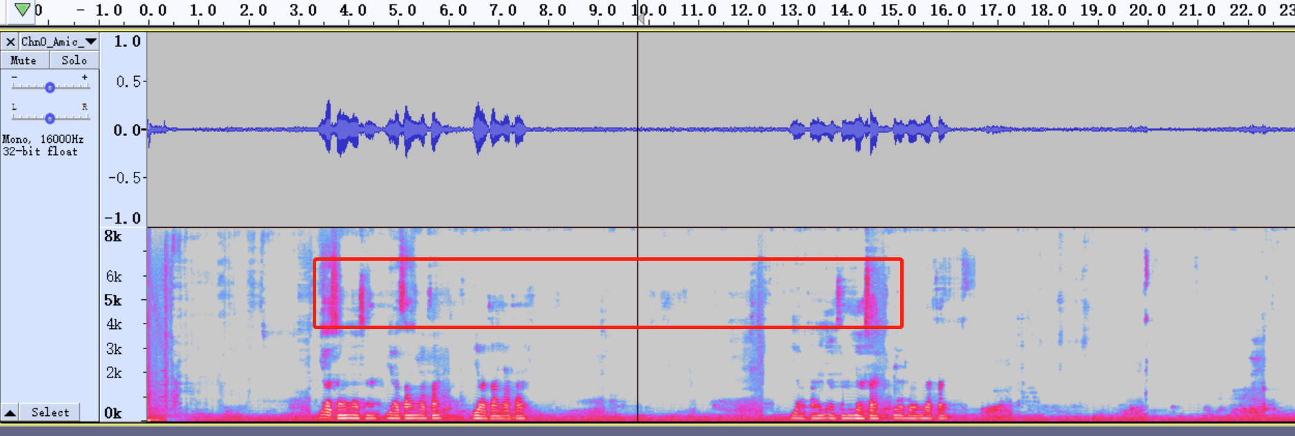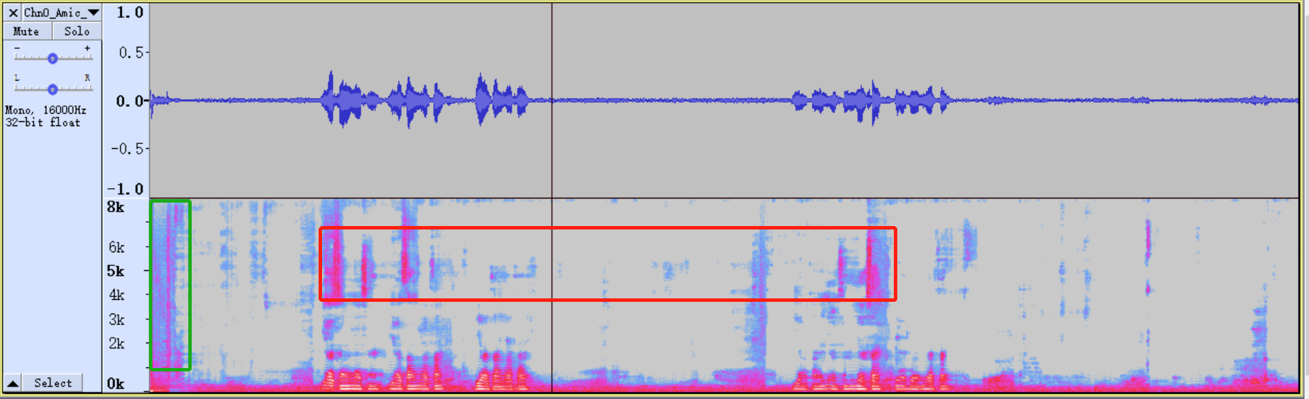 As shown below, the audio files are AecAiIn, AecAoIn and AecOut. Speaker distortion makes AecAiIn to have a frequency band, which AecAoIn does not have (the marked part in the figure), which causes the AEC algorithm to fail to obtain the correct reference signal and makes the AEC algorithm incompletely eliminated. The frequency band where the echo exists is exactly the frequency band produced by the speaker distortion.