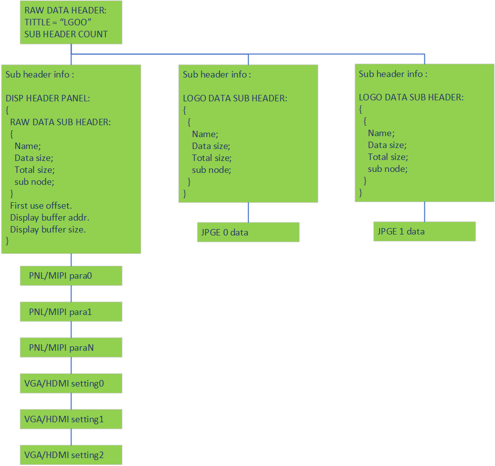Sub header has two kinds of data, one of which is to save the data of screen parameters and HDMI/VGA display parameters. These data are saved in Flash in the form of C language structure. The other is that several Sub headers store Jpeg pictures.