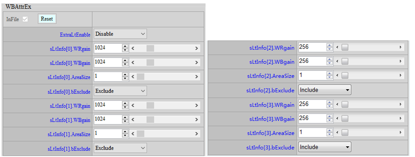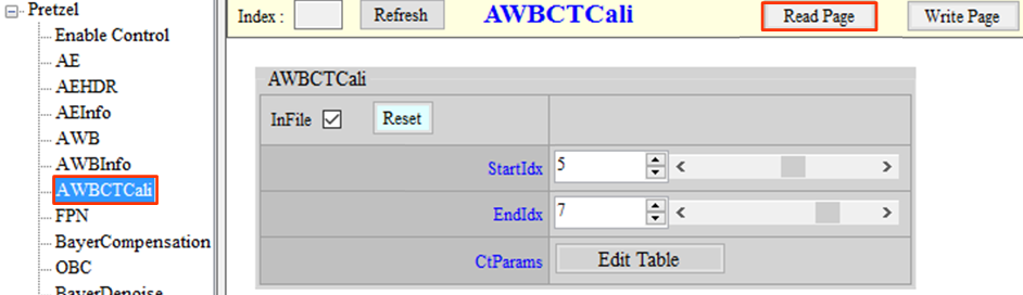 设定StartIdx和EndIdx来决定欲做AWB的色温范围,建议设定为StartIdx = 2、EndIdx = 7,也就是当环境色温在2300K~10000K才会做AWB。