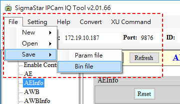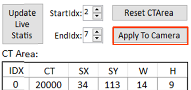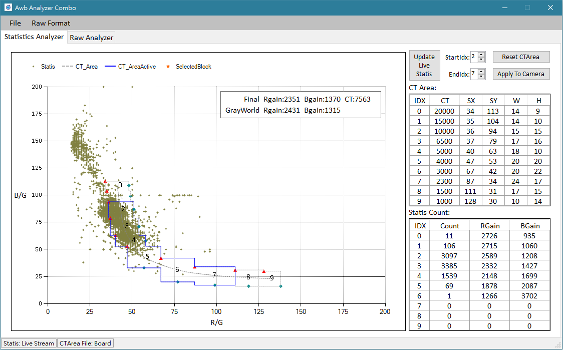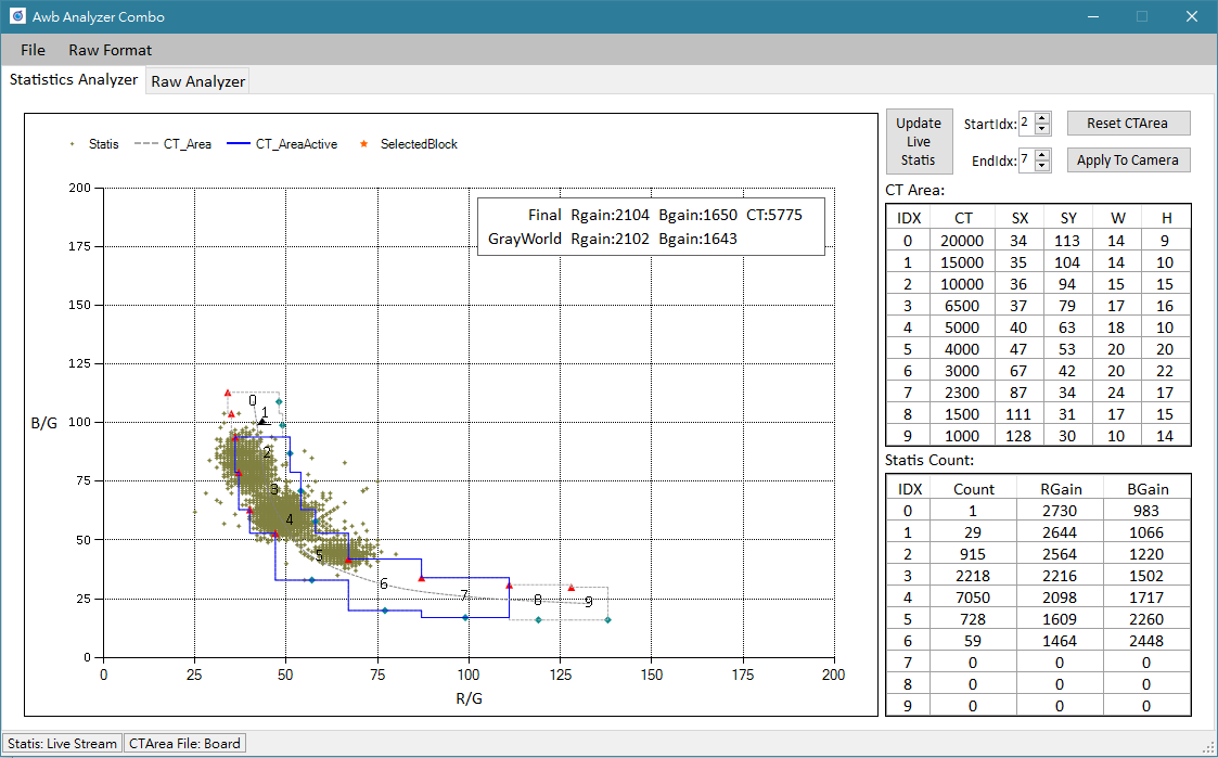 调整完成后,点选File→Save CTArea储存调整好的色温框,接着点选Apply to Camera即可套用到板子上,关闭Awb Analyzer Combo。回到API tool接口点选左侧AWBCTCali,再点选ReadPage将板子上的设定读回,最后点选上方File→Save→Bin file将AWB色温曲线设定存至API的bin檔中。