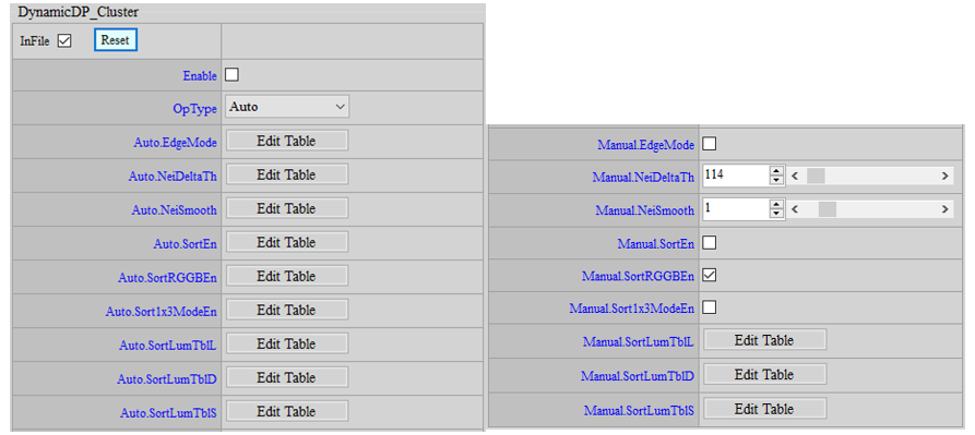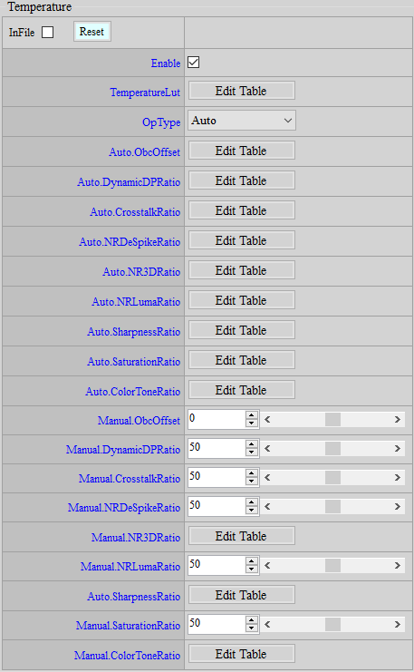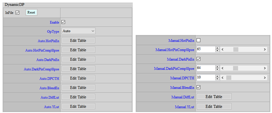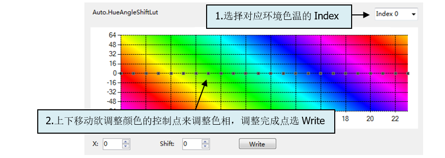 HueLut:可依需求局部调整色相,值域-64~64,0代表不改变,参数切换是根据色温。