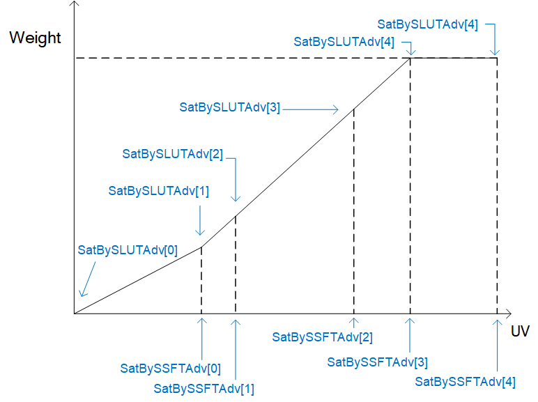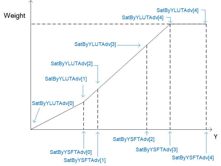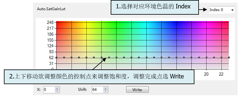 SatLut:可依需求局部调整饱和度,值域0~255,64代表不改变,参数切换是根据色温。