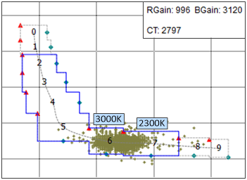 共有10个色温框可供调整,每个色温框所代表的色温可参考右方CTAera的表格,蓝色框区域才是实际有效的色温曲线范围,未落入此区域的统计数据则不采用。用鼠标按住色温框的控制点进行拖曳可直接对色温框进行调整。
