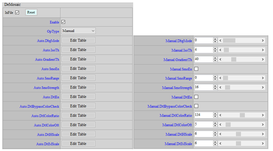 HueLut_ByIso:可依需求局部调整色相,值域-64~64,0代表不改变,参数切换是根据gain。