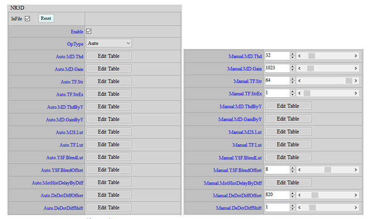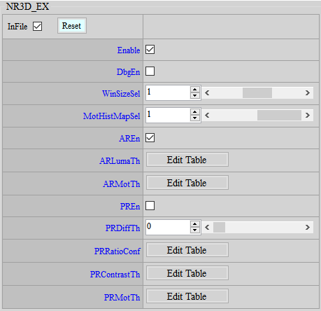 | 3DNR_Ex | 新增多种计算motion信息的屏蔽 新增一种计算motion信息的方式 | N/A | bDbgEn u8WinSizeSel u8MotHistMapSel |