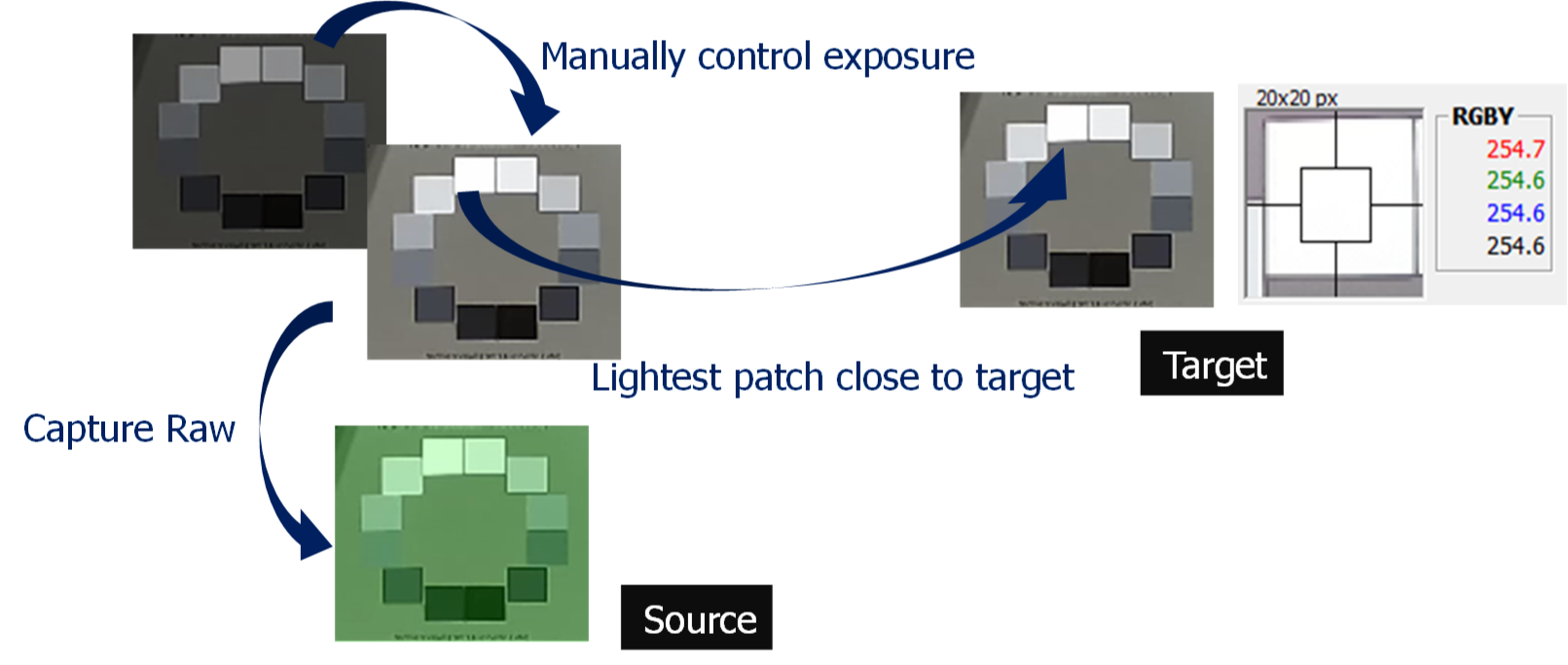 将环境架设好,首先拍摄调整机台与对比机台fitting所需的image。由于曝光会影响亮度,因此gamma fitting要在相同曝光的基准上会比较准确。要得到接近的曝光,最简单的方式就是拍摄时(调整机拍raw,对比机拍jpg)让OECF最亮色块尽量接近255但不要刚好255,因为我们不知道对比机gamma长甚么样子,但通常gamma最亮点是不会变的,因此拿它来当基准会比拿其它点当基准要好。