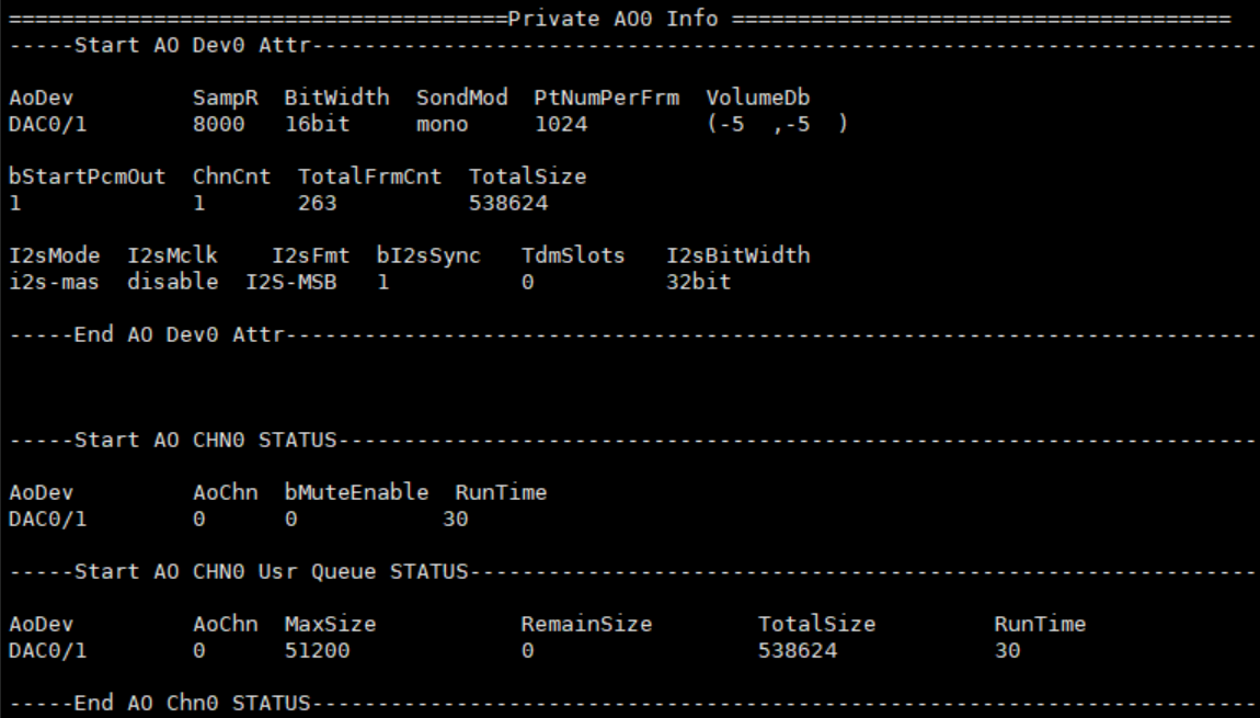 stereo:立体声PtNumPerFrm 每帧的采样点数 VolumeDb AO设备的增益(左声道,右声道) bStartPcmOut 是否起播 ChnCnt AO设备通道数 TotalFrmCnt APP送给AO设备的帧数 TotalSize APP送给AO设备的数据量 I2sMode I2S 的工作模式