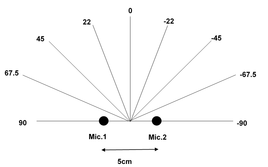 当两个麦克风距离(distance)为5cm时,下图描述音源方向(direction)来源的定义: