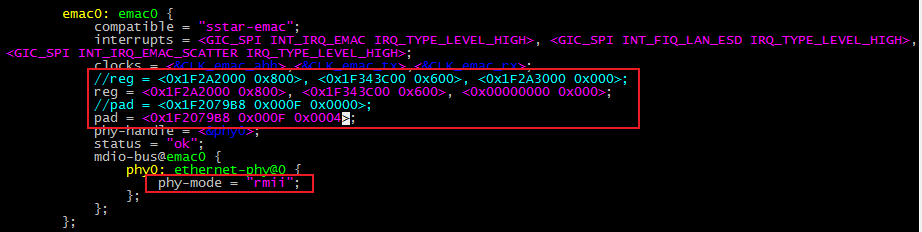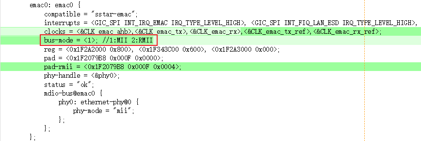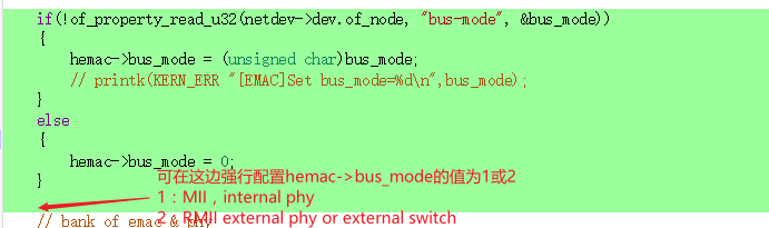 可在dts解析阶段MDev_EMAC_dts中,强行配置hemac->bus_mode的值为1或2,而不从dts中获取value