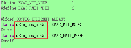 可在初始化阶段如MHal_EMAC_Power_On_Clk中,配置m_bus_mode的值为EMAC_MII_MODE或EMAC_RMII_MODE