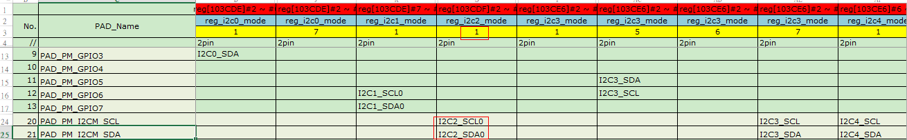 参考文档《SSR910 HW Checklist.xlsx》(如果是920平台则看920的HW文档)GPIO tmux栏位,看到PAD_PM_I2CM_SCL/PAD_PM_I2CM_SDA可以作为多组IIC来用,这里根据硬件规划选择使用,比如做为IIC2使用,则对应是mode1。