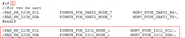 找到padmux dtsi,比如使用的是kernel\arch\arm\boot\dts\mercury6-ssc017a-s01a-padmux.dtsi,添加PAD_PM_I2CM_SCL/PAD_PM_I2CM_SDA复用关系,并注释掉有冲突或没在使用的管脚,类似下图修改。