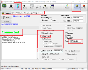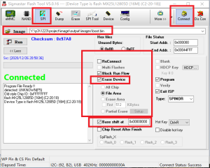 1. 打开isptool,选择spinor,然后点击connect,工具显示connected表示已连接成功。